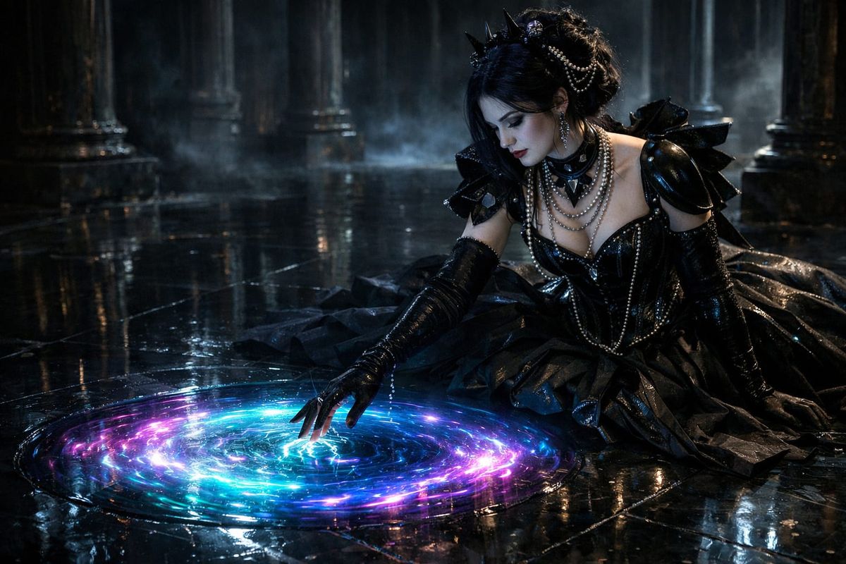 In the hush of the ancient hall, she kneels in black satin and shadow, pearls trembling against her gloves as her fingertips meet the swirling light. The portal blooms beneath her like a secret waking, its colors rising in slow, enchanted spirals that paint her crown in violet fire.