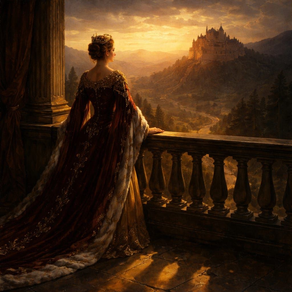 This image shows a solitary empress on her castle balcony at sunset, with a road leading to the castle. Rendered in painterly realism with dramatic lighting, reminiscent of classical portraiture.