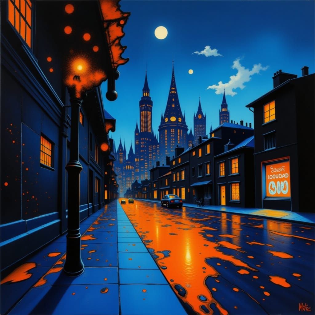 A striking cityscape captured in bold graphic novel style, featuring contrasting blue and orange hues with dramatic lighting. Experience the electric energy of urban nightlife.