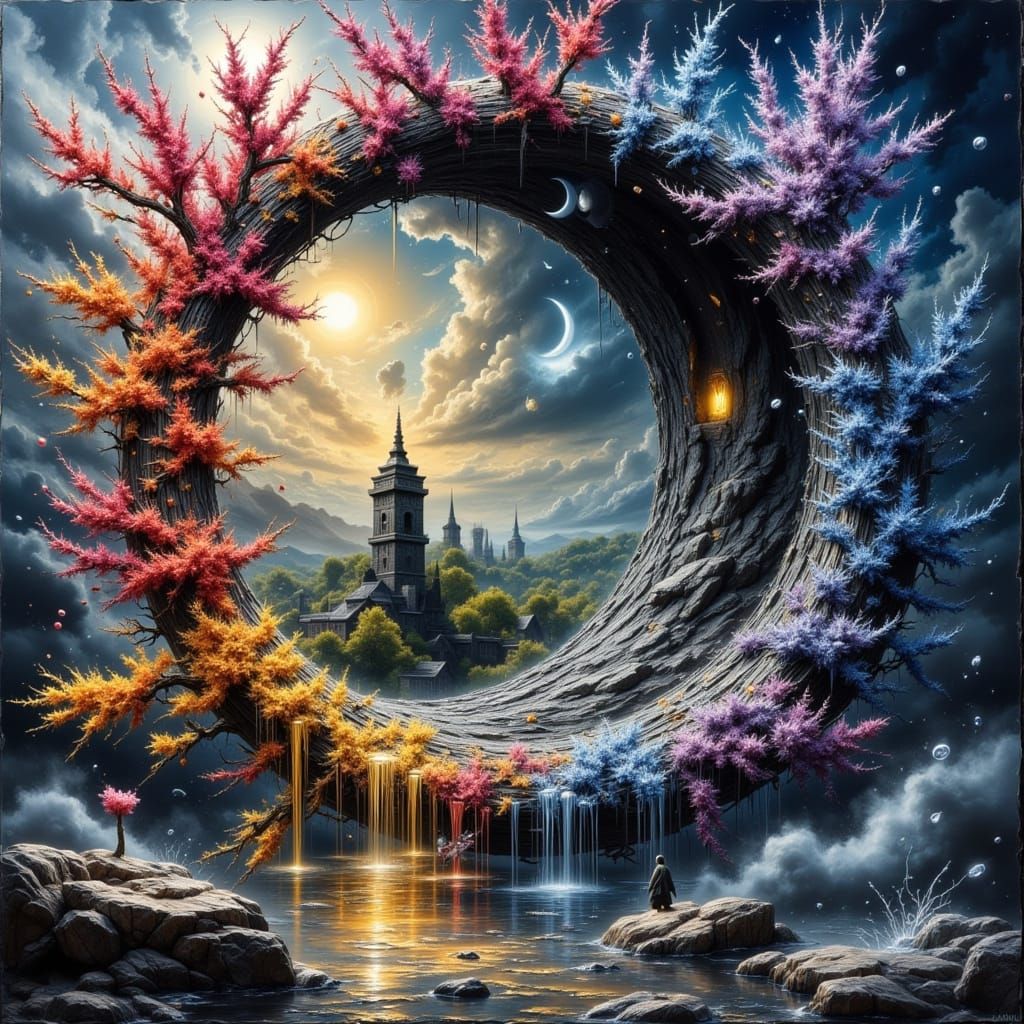 This image showcases a dynamic double exposure blending the four seasons with a Japanese Sakura Garden. It features a spiraled world of dark and light with a miniature moon against a night sky, rendered in a maximalist, psychedelic concept art style.