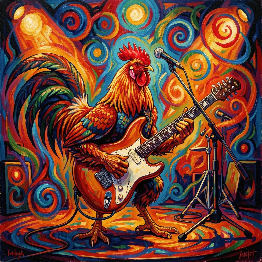 This abstract artwork features a rooster playing an electric guitar with dynamic energy. Rendered with fine details and vibrant, complementary colors, it evokes emotion and movement.