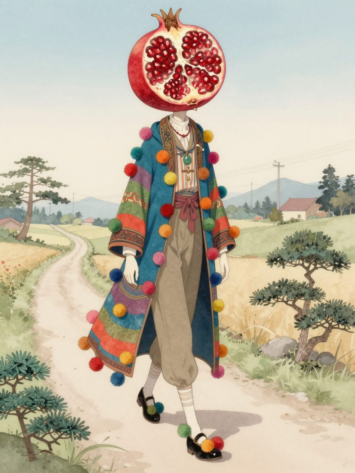 A watercolour illustration of a tall, slender figure with a pomegranate for a head, wearing a long, ornate coat and decorative pompoms. The composition is inspired by Japanese art.