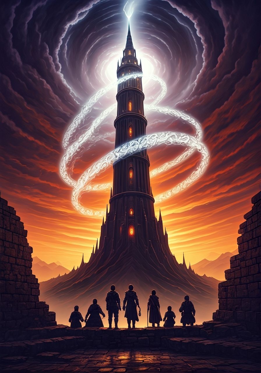 A dramatic scene of a tower standing defiant in the center of a perfect, unnatural eye of a storm. The sky is a chaotic mix of deep purples and angry oranges, with lightning striking the tower’s spire but being absorbed rather than deflecting. The "calling force" is visualized as a slow, hypnotic spiral ...