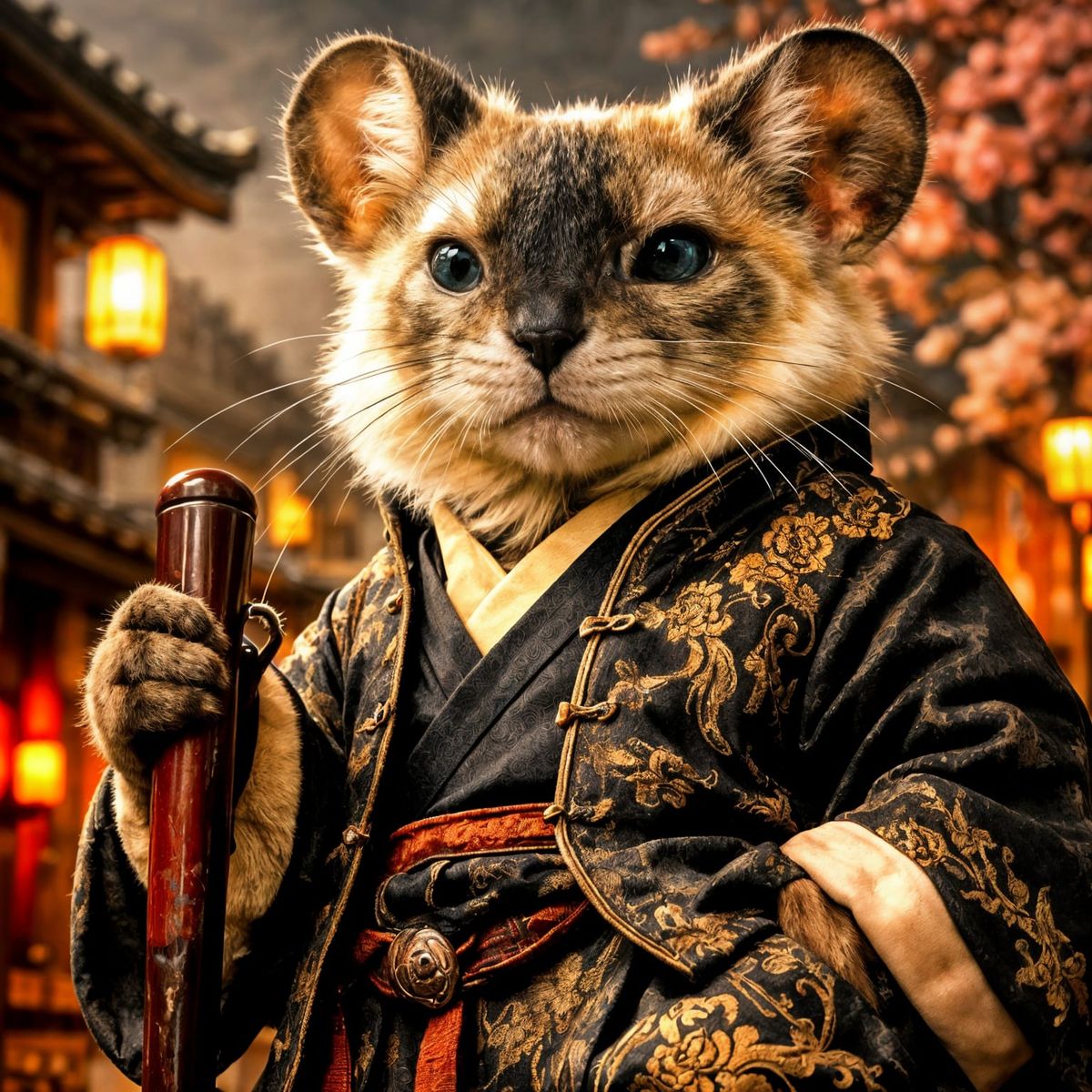 A hyperrealistic portrait of a Siamese cat as a wise Kung Fu master, holding a walking stick in a Japanese street setting with cherry blossoms, inspired by traditional Asian art.