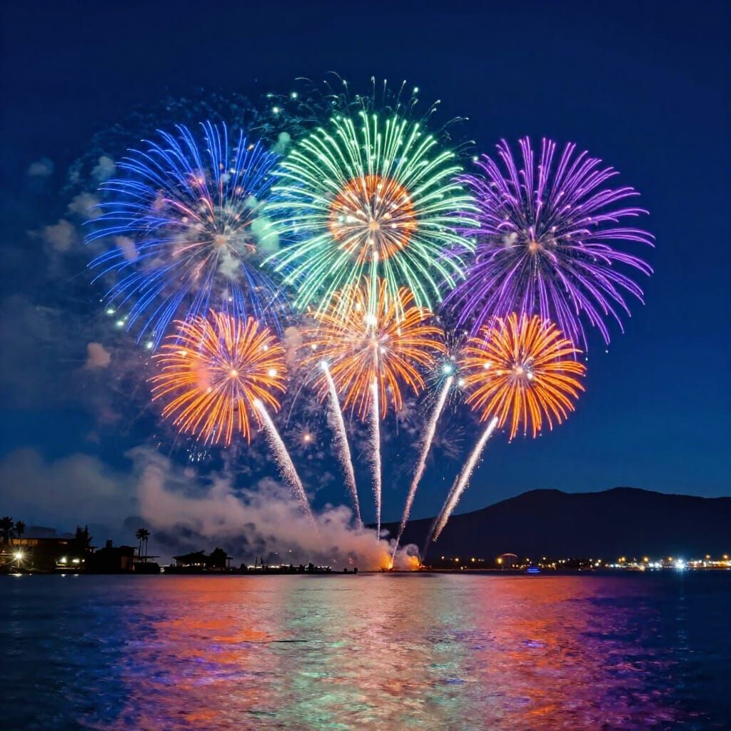This image shows a stunning nighttime fireworks show with colorful explosions illuminating a dark blue sky and reflecting on calm water below. Photorealistic style.