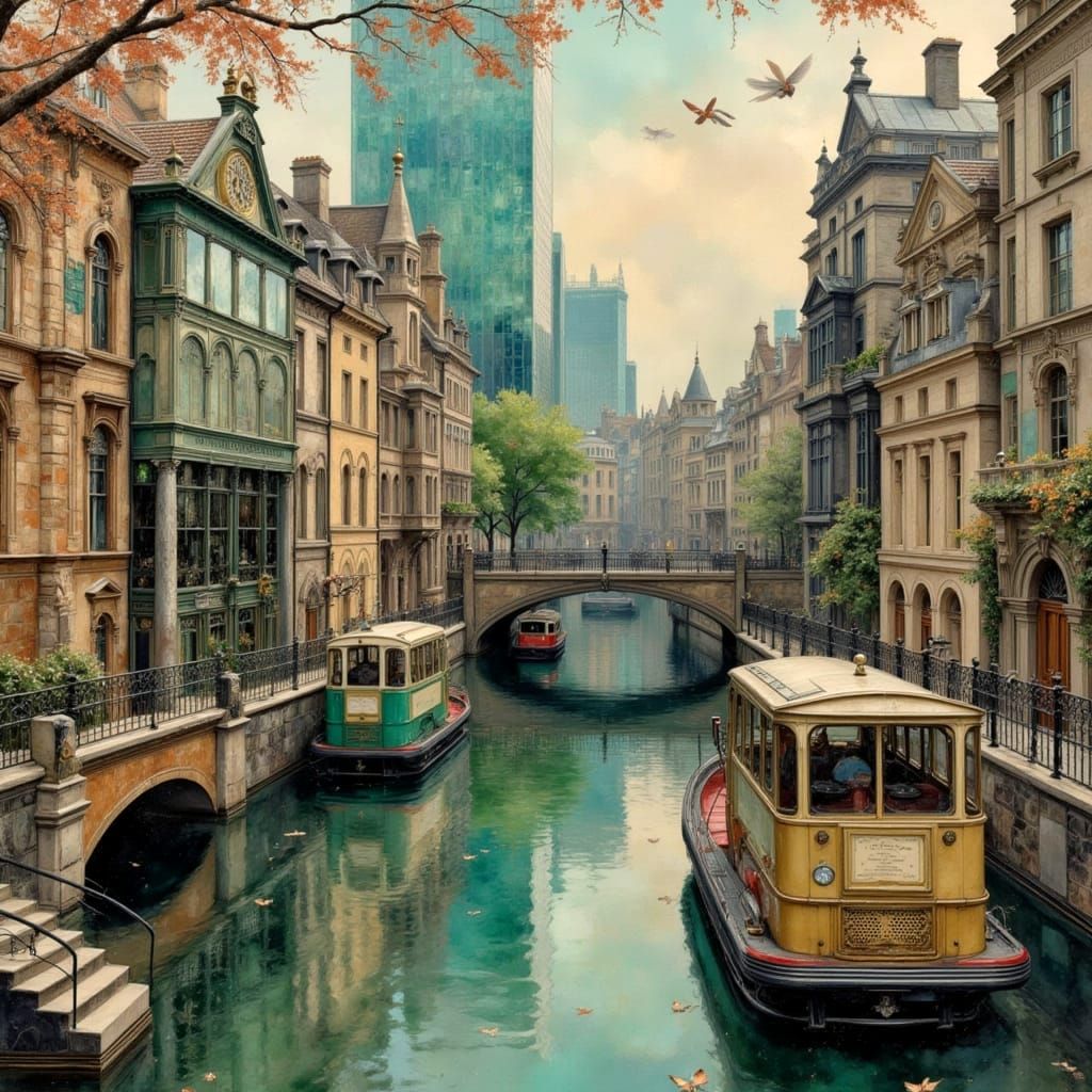 This surreal mixed media collage features old London town along a river, with art deco buildings. It has a shimmering, textured look with deep greens, blues, and silver.