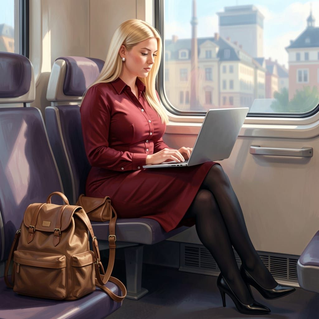 A semi-realistic digital painting of a focused woman working on her laptop on a train, with a cityscape blurred in the background. Features vivid colors and detailed brush strokes.