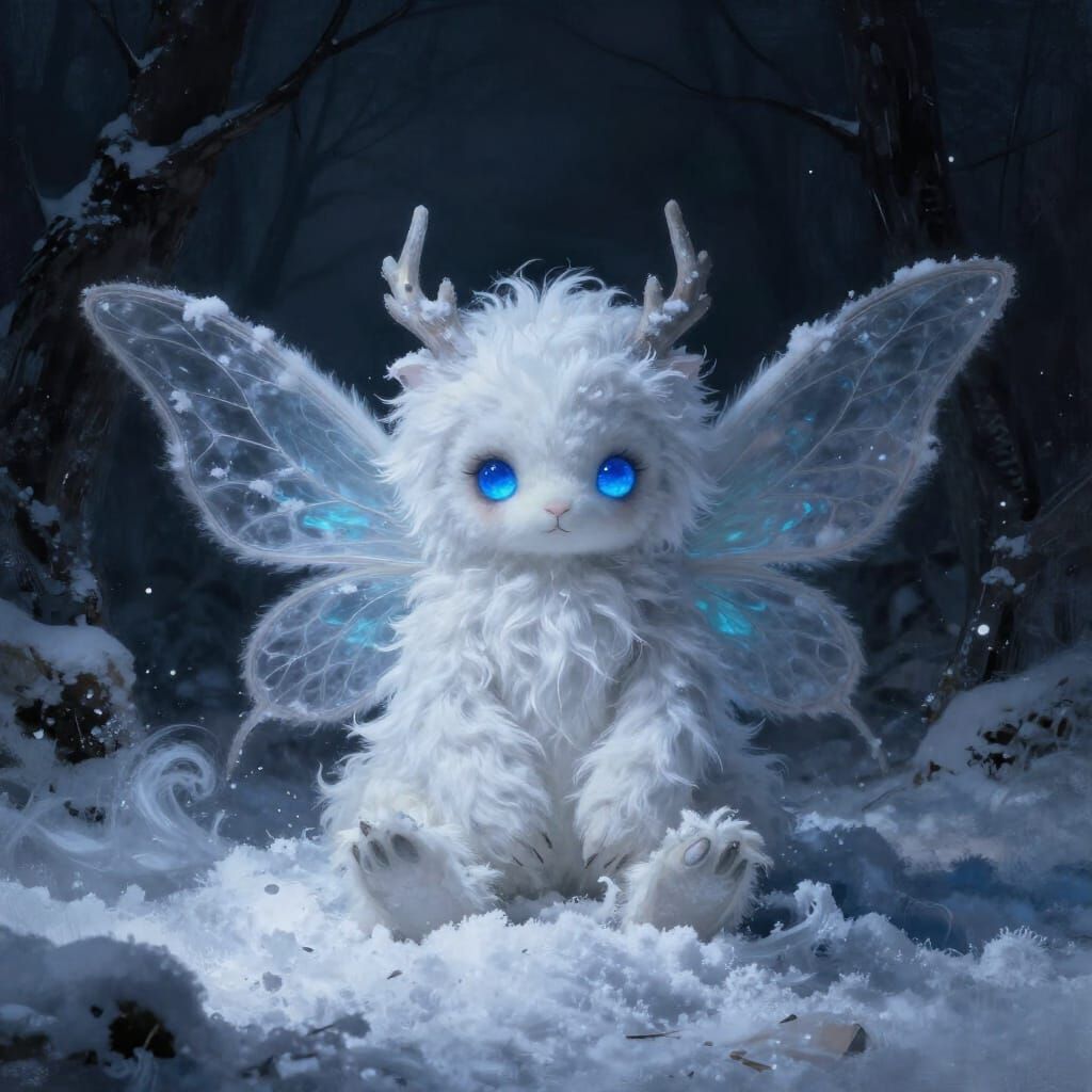 This image shows a soft, white fur plush toy with glowing blue eyes, sitting on swirling snow. It's depicted in a dark, painterly style with dramatic lighting and a cool color palette, evoking gothic fantasy.