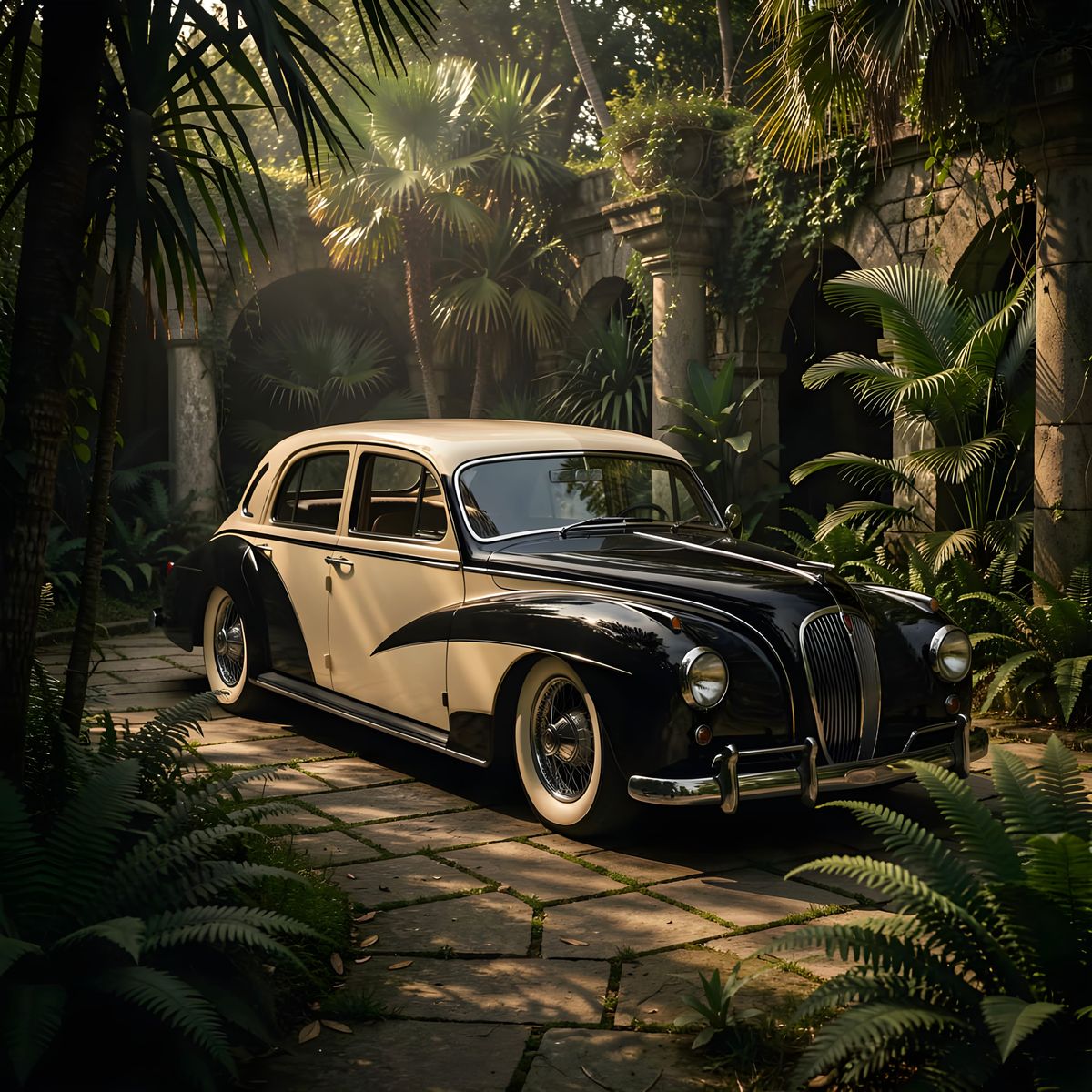 This image showcases a striking, low-slung 1939 sports limousine in a hidden garden. Dramatic lighting creates deep shadows, emphasizing textures in a Caravaggio-inspired style.