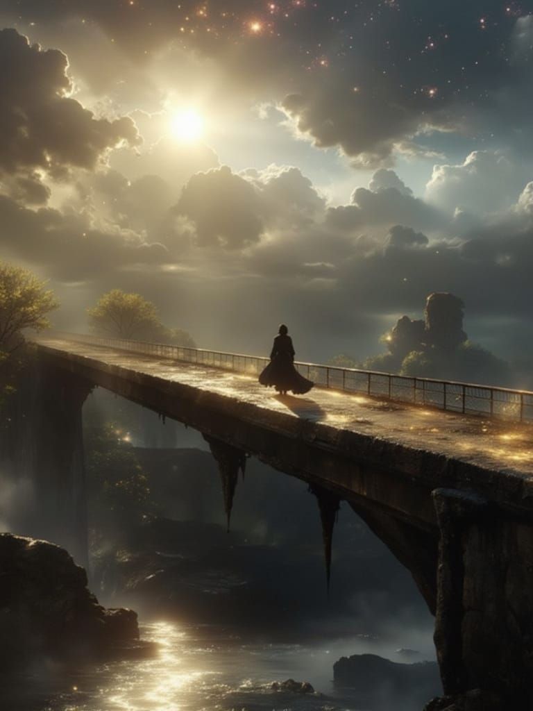 This image shows a surreal, dreamlike bridge in the vastness of space, blending futuristic and mystical elements in a neon-lit, hyperrealistic world.