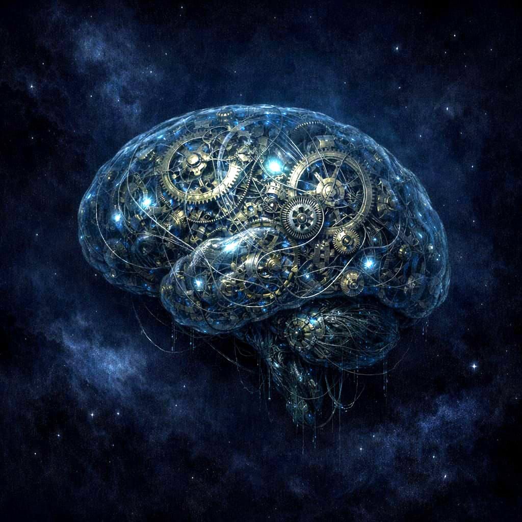 This image shows a detailed clockwork brain floating in indigo space, illuminated by internal light. Evokes isolation with nebulae and stars, in a dark, gothic fantasy illustration style.