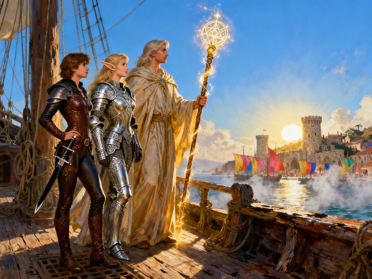 This D&D inspired artwork shows a wizard, paladin, and rogue on a ship deck, approaching a peaceful, sun-drenched coast. Features dramatic lighting in a detailed fantasy illustration style.