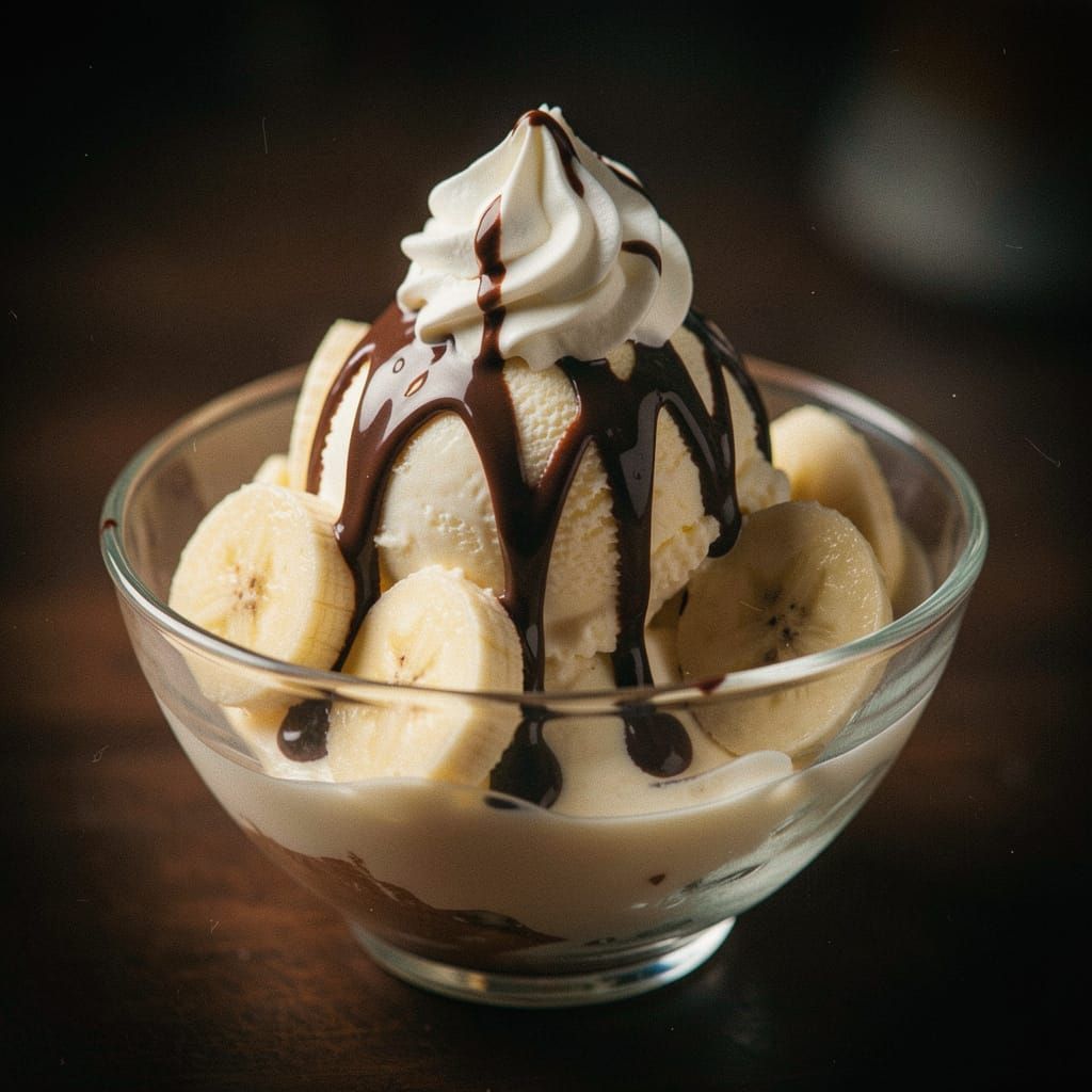 This image showcases a decadent vanilla ice cream sundae, drizzled with chocolate sauce, topped with bananas and whipped cream. Photographed with cinematic realism and atmospheric lighting, it captures exquisite detail and texture.