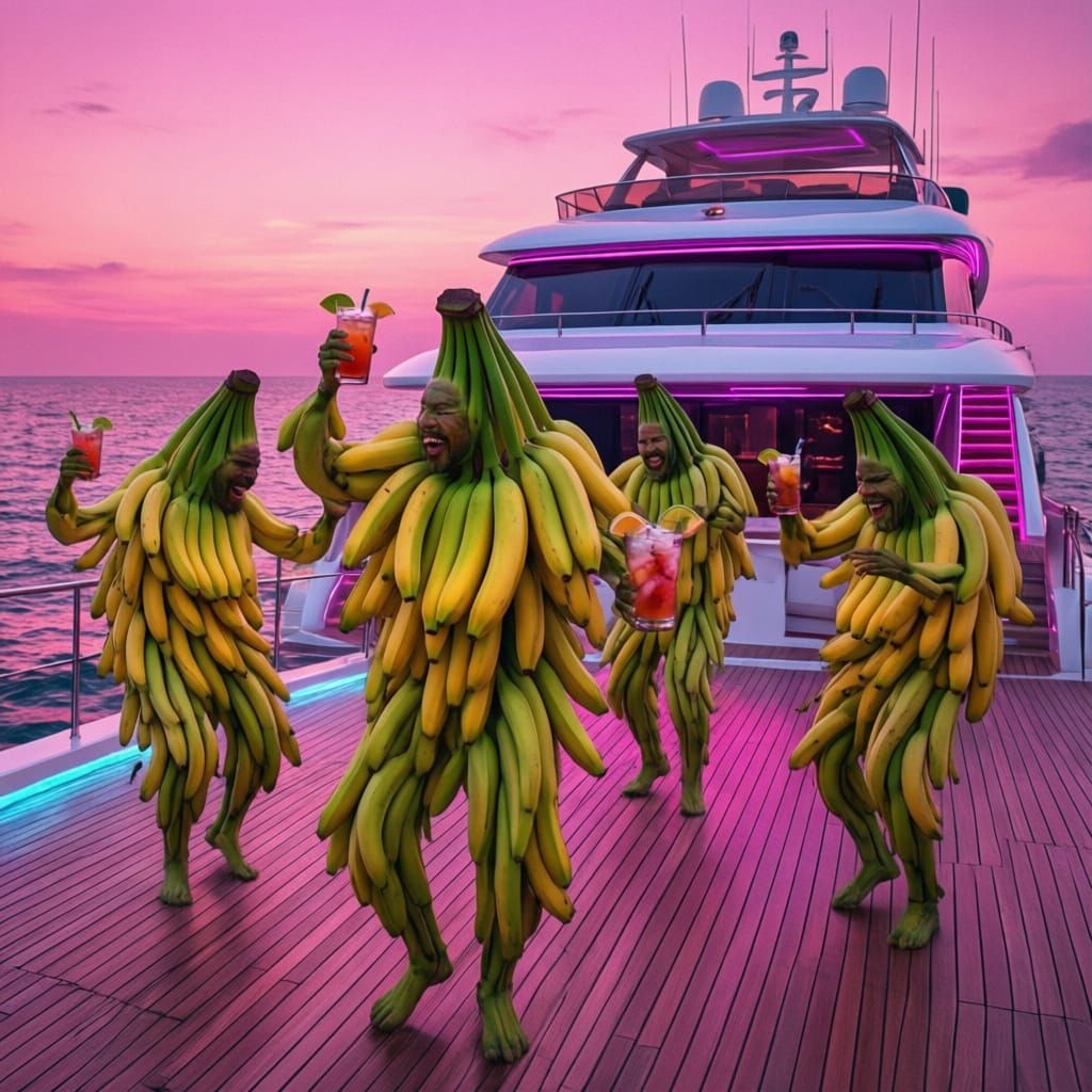 This surreal image depicts anthropomorphic bananas in a ska dance with drinks aboard a futuristic yacht sailing on a vibrant pink sea. A unique digital art concept.