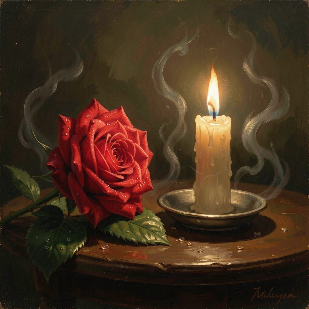 This image shows a single, glowing red rose beside a flickering candle, creating a mystical and peaceful atmosphere with dancing shadows and swirling mist. Rendered in a dreamy, romantic oil painting style.