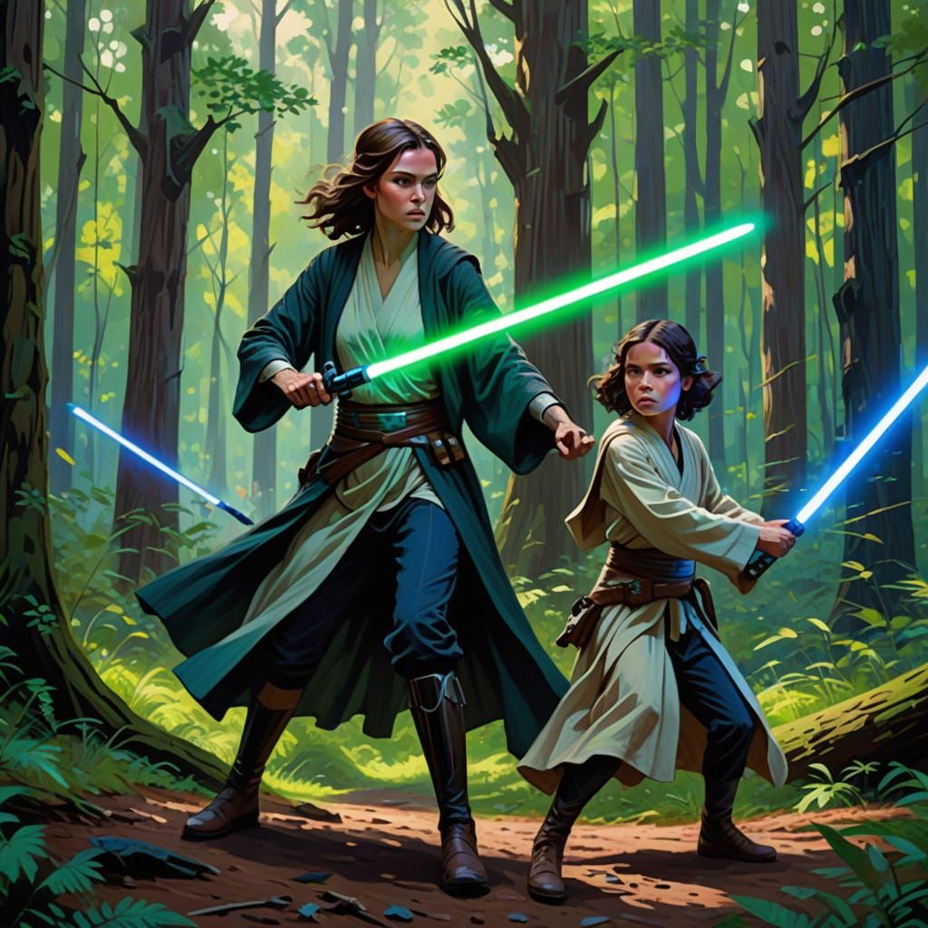 A stunning impressionistic painting of a Jedi Knight and her young Padawan training in a forest clearing, their green and blue lightsabers flashing with fluid, graceful movements, set against a backdrop of dynamic lighting and vibrant colors.