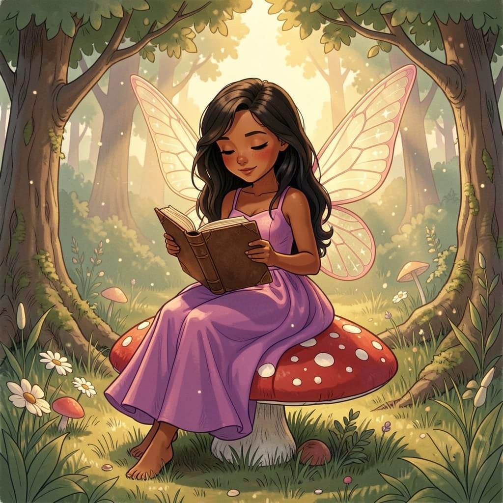 This image shows a woman reading a book while sitting on a large mushroom in a sun-dappled forest. Rendered in a charming storybook illustration style with delicate linework and warm, earthy tones.