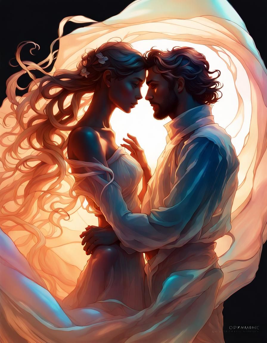 This image shows a romantic couple silhouetted against luminous, sunlit fabric rippling in the wind. The opalescent portrait is rendered with dynamic lighting and intricate detail, in an Art Nouveau style.