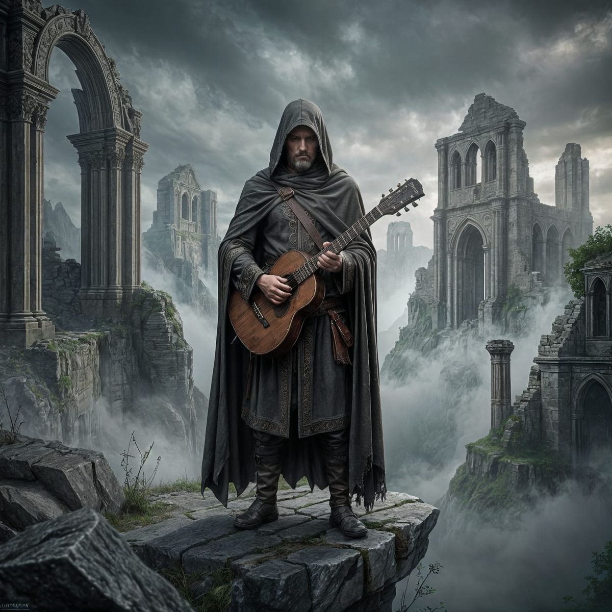 This image depicts a weary bard at a ruined kingdom's edge. Dark fantasy concept art style with gritty, atmospheric textures and dramatic shadows.