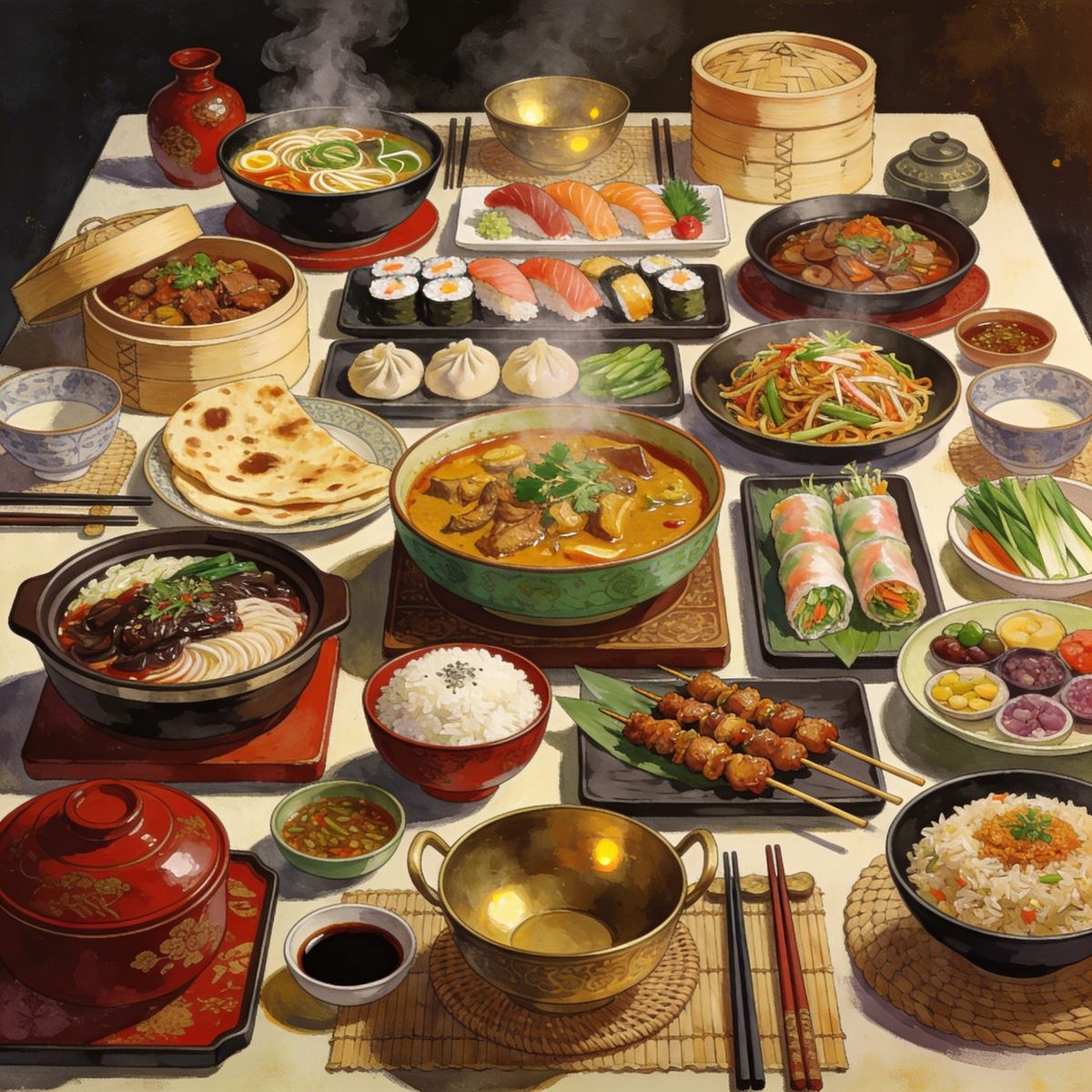 This image presents a generous overhead view of a table laden with diverse, authentic Asian dishes. Featuring steaming bowls, sushi platters, curries, dumplings, and more, arranged with traditional tableware and vibrant colors.