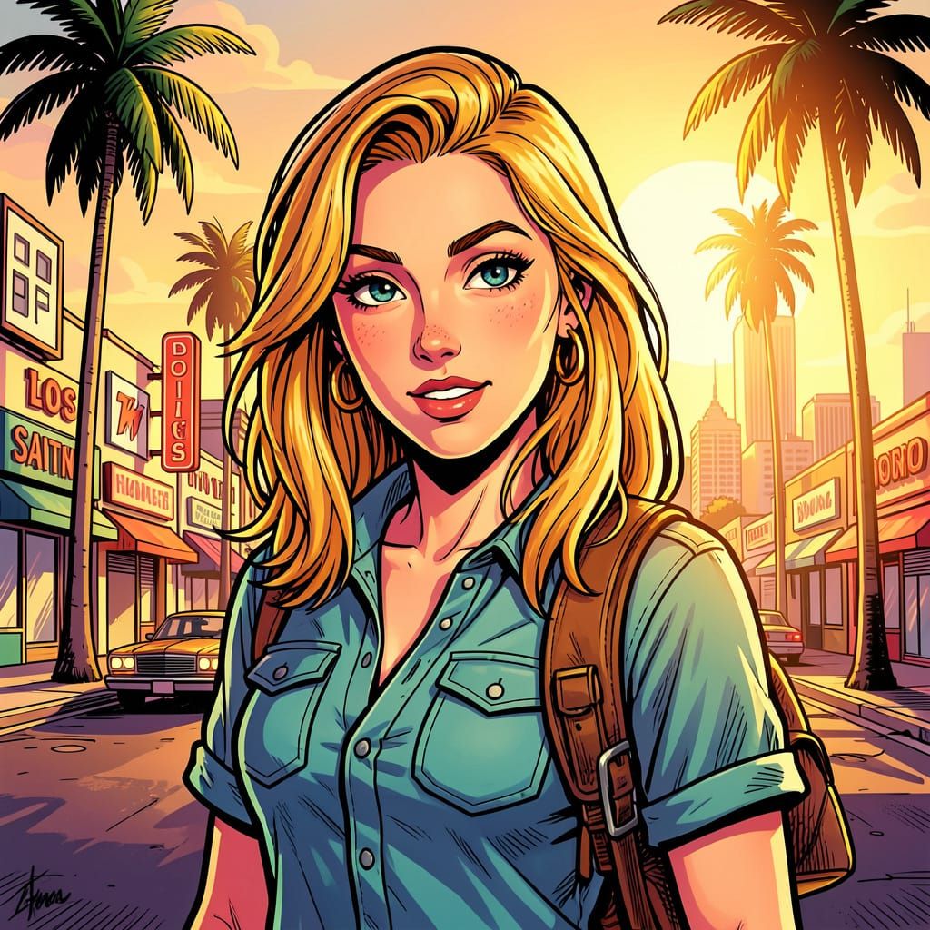 This illustration features Tracy from GTA V in a lively comic book style with bold colors and outlines. The scene captures her energy against a sunny Los Santos backdrop.