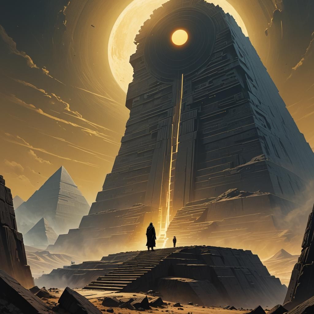 A captivating image of a Mesopotamian pyramid with a lone figure gazing at a black sun. Evokes futuristic architecture and mystical artistry with golden accents and luminescent mists.