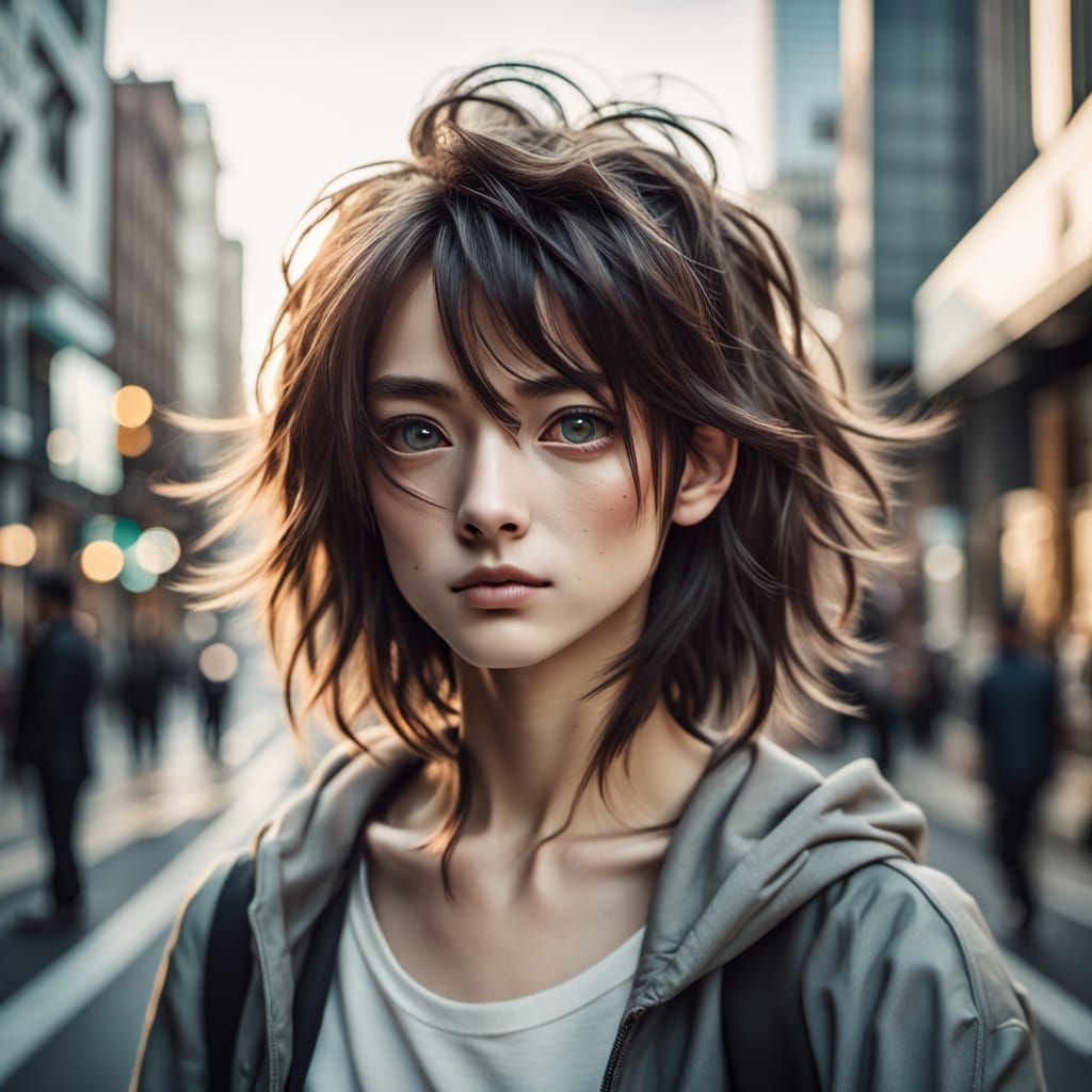 A medium shot portrait of a young person on a city street, captured with cinematic lighting and a shallow depth of field. Features natural skin texture and expressive eyes, with a subtle anime aesthetic.