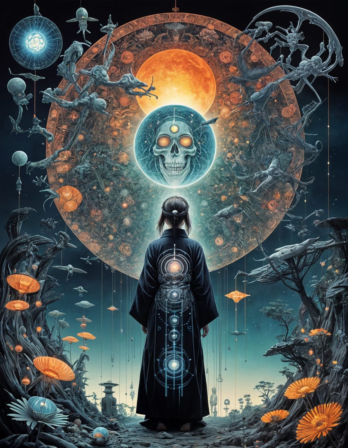 This image shows a woman in a Japanese yukata holding a glowing firefly cage. A skeleton shadow is cast against a twilight background with biomechanical and collage elements.