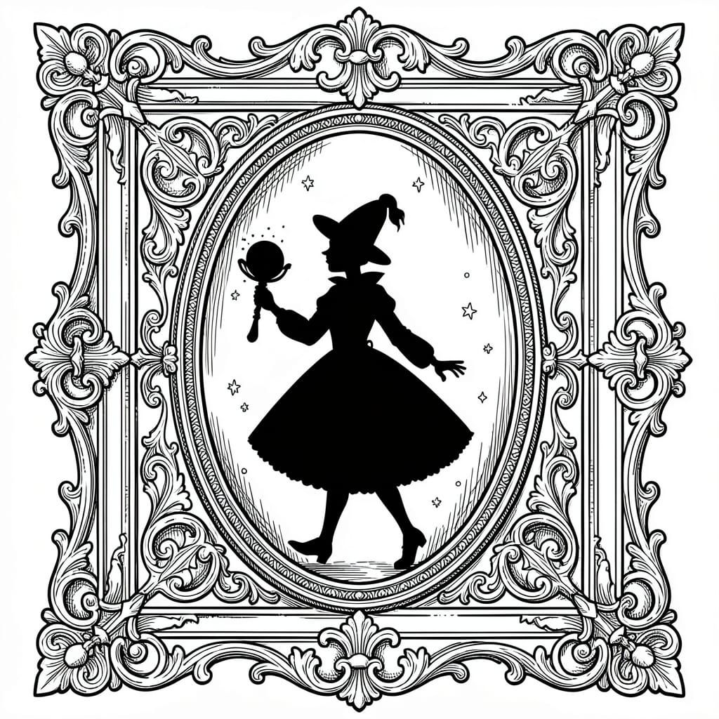 A black and white silhouette line-art illustration of Alice in Wonderland stepping through a magic looking-glass portal in Victorian style. Features an ornate frame.