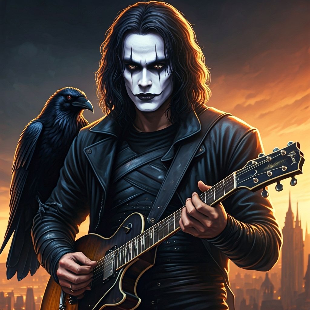 This image shows Brandon Lee as The Crow, playing guitar on a rooftop with distinctive makeup. Features a raven on his shoulder, dramatic lighting, and deep shadows in a maximalist digital painting style.