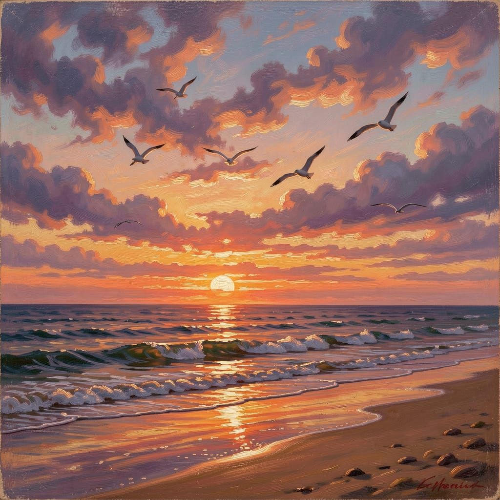 This image captures a stunning sunset over a tranquil beach, with birds gracefully soaring through the vibrant sky.