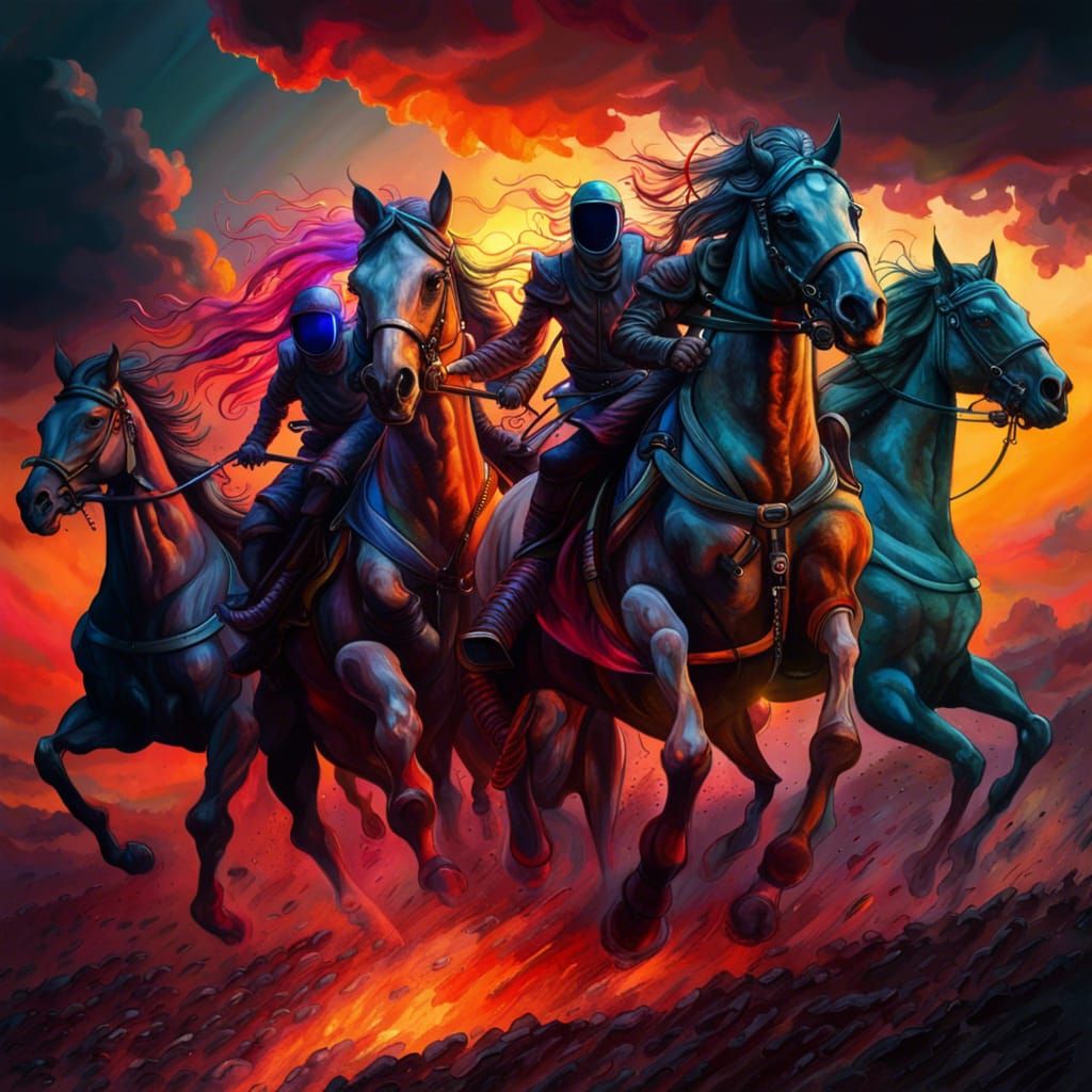 A dramatic image depicts the four horsemen of the apocalypse riding toward the future, pursued by artificial intelligence, set against a colorful sunset backdrop. The scene is rendered with hyperrealistic detail.