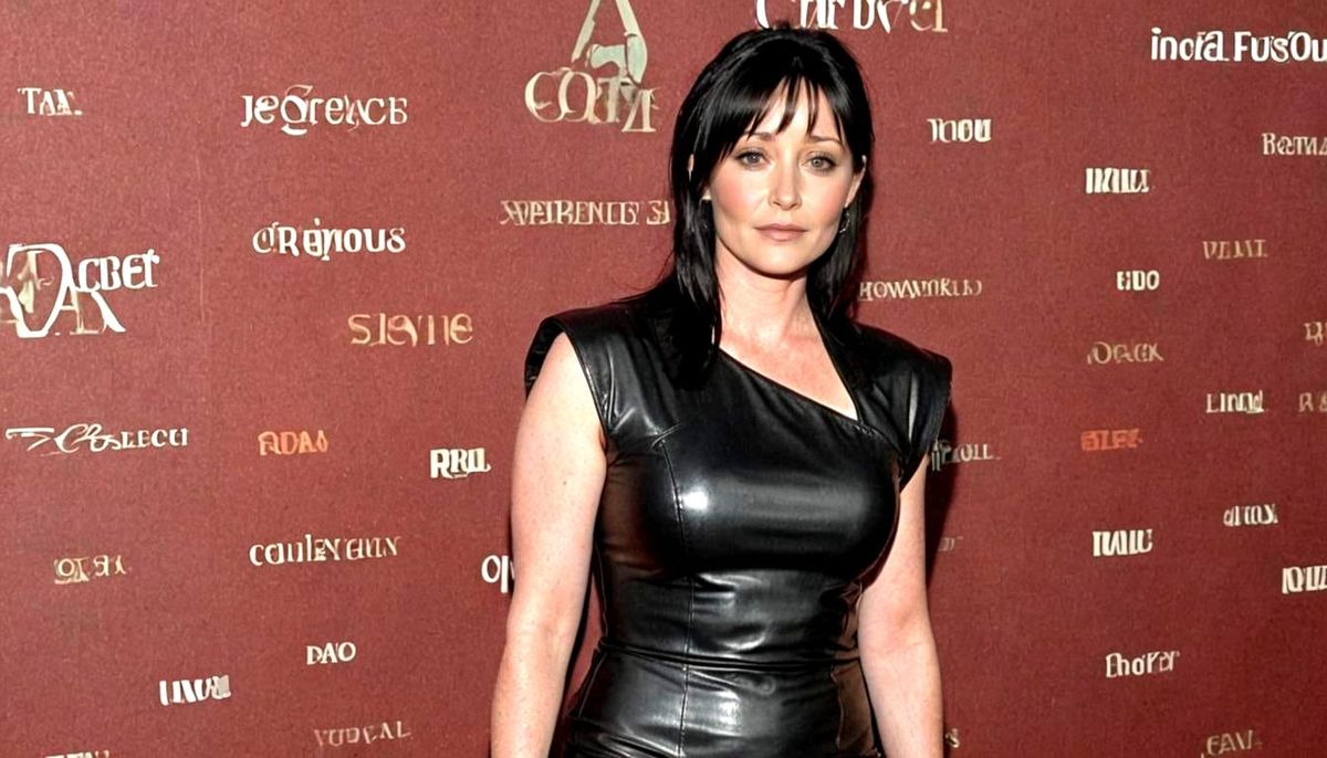 A full-body shot of a woman in a black leather minidress posing on a red carpet. The image captures the glamorous style of a celebrity appearance.