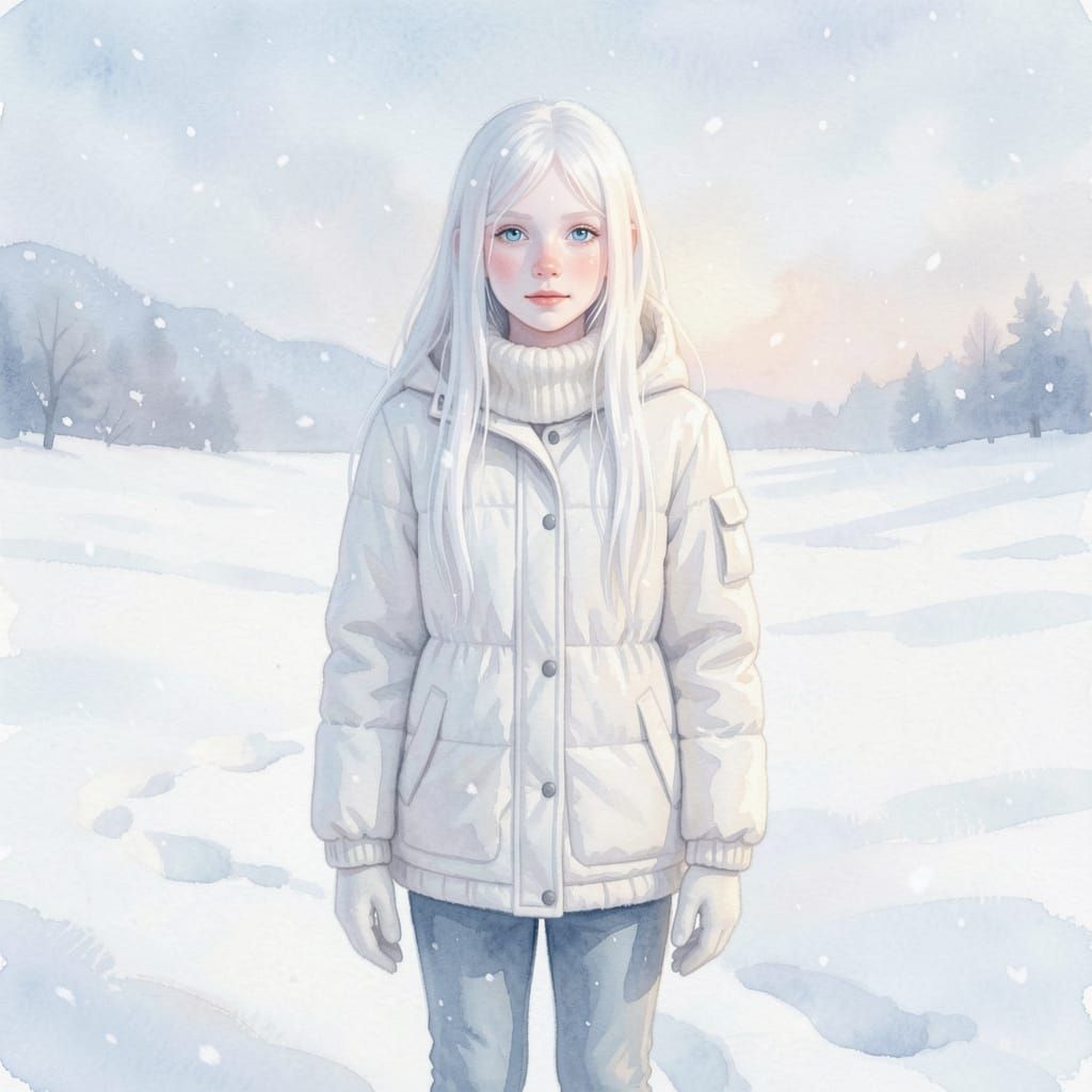 This detailed digital painting features a serene albino teenager with white hair and blue eyes, warmly dressed in white amidst a vast snowy expanse. The soft, diffused winter light creates a melancholic yet intimate atmosphere, with watercolor touches enhancing the snowy textures.