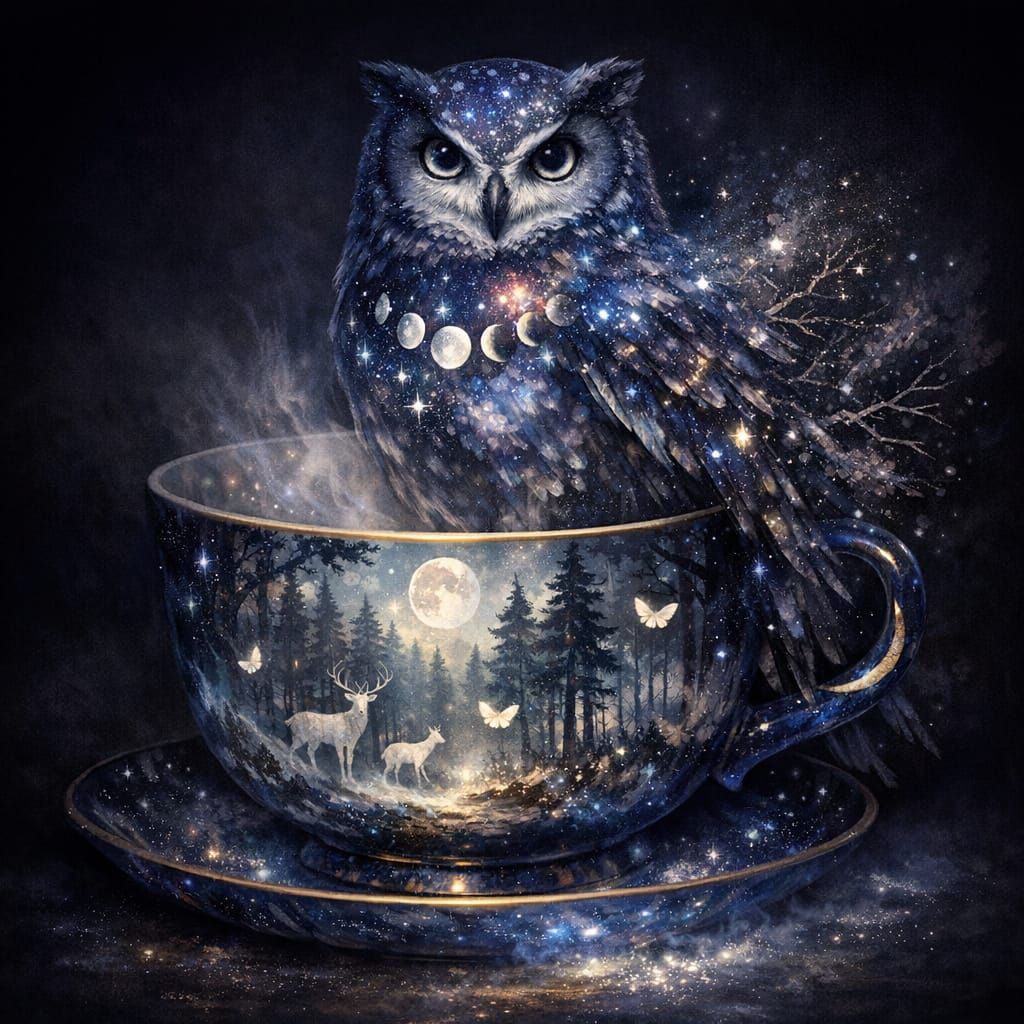 A celestial owl perched inside a porcelain teacup that seems forged from night sky and stardust, its feathers patterned with nebula clouds, constellations, and silver moon phases. The body of the teacup contains a double-exposure forest scene within its porcelain walls, moonlit pines, drifting mist, ...