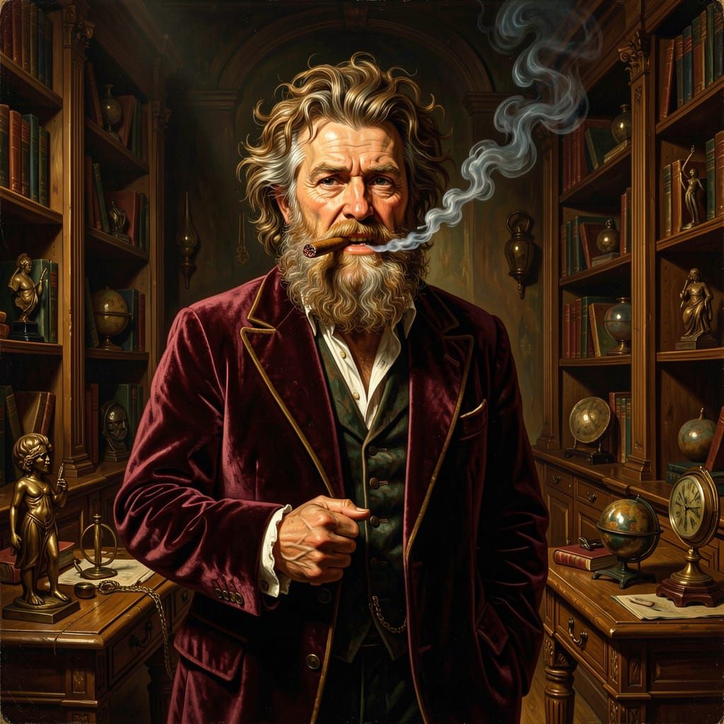A man with a wild beard and velvet jacket smokes a cigar in a dimly lit study. Features dramatic lighting and rich colors in an opulent baroque style.