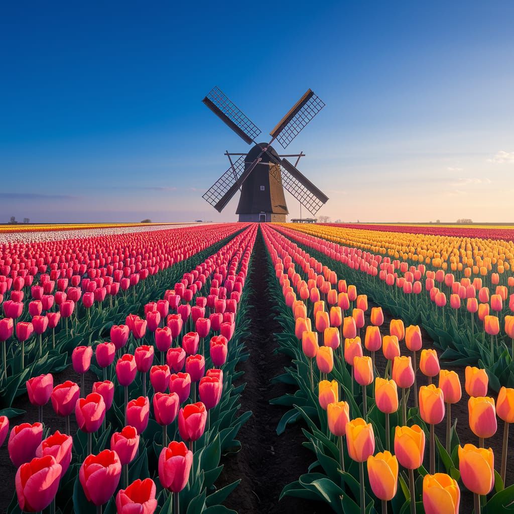 A stunning photograph of a sprawling Dutch tulip field in full bloom, featuring a gradient of red, pink, orange, and yellow flowers. A rustic windmill stands in the distance under a bright blue sky, captured in golden light.