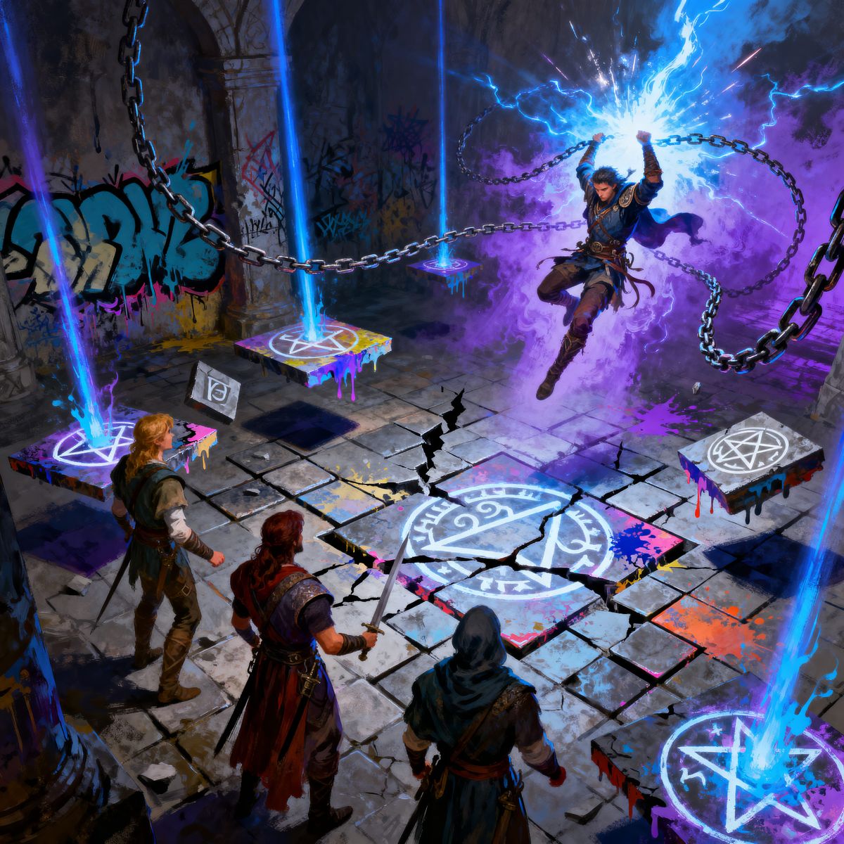 This image depicts adventurers in a dangerous arcane chamber, illuminated by blue and purple light. Features include magical traps, energy, and shifting gravity, rendered with vibrant, high-contrast effects in a mixed media style.