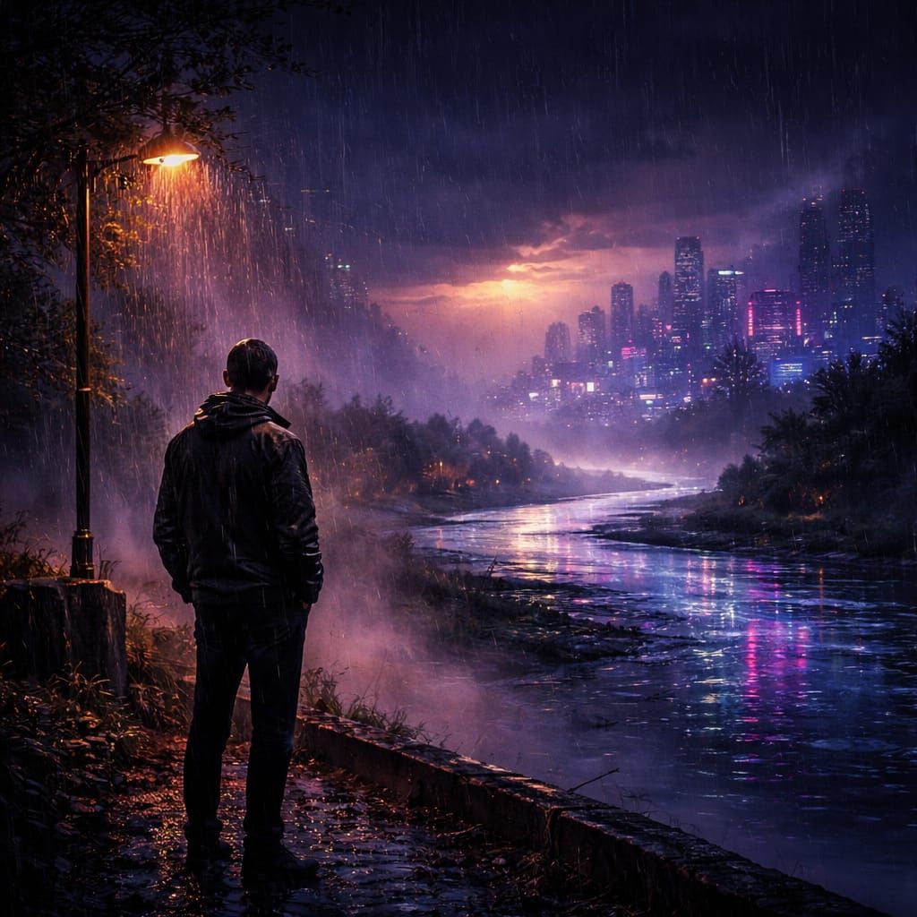 A lone figure stands by a glowing river beneath a dark sky with ultraviolet rain. Cinematic mist and neon reflections create a mood of quiet resolve and hope.