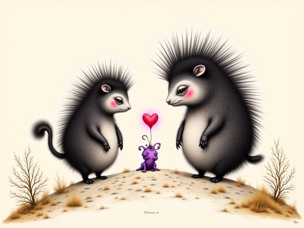 A fine-art illustration of fuzzy donuts interacting with a glowing neon prawn. Features a vintage zoological plate aesthetic with watercolor washes and delicate details.