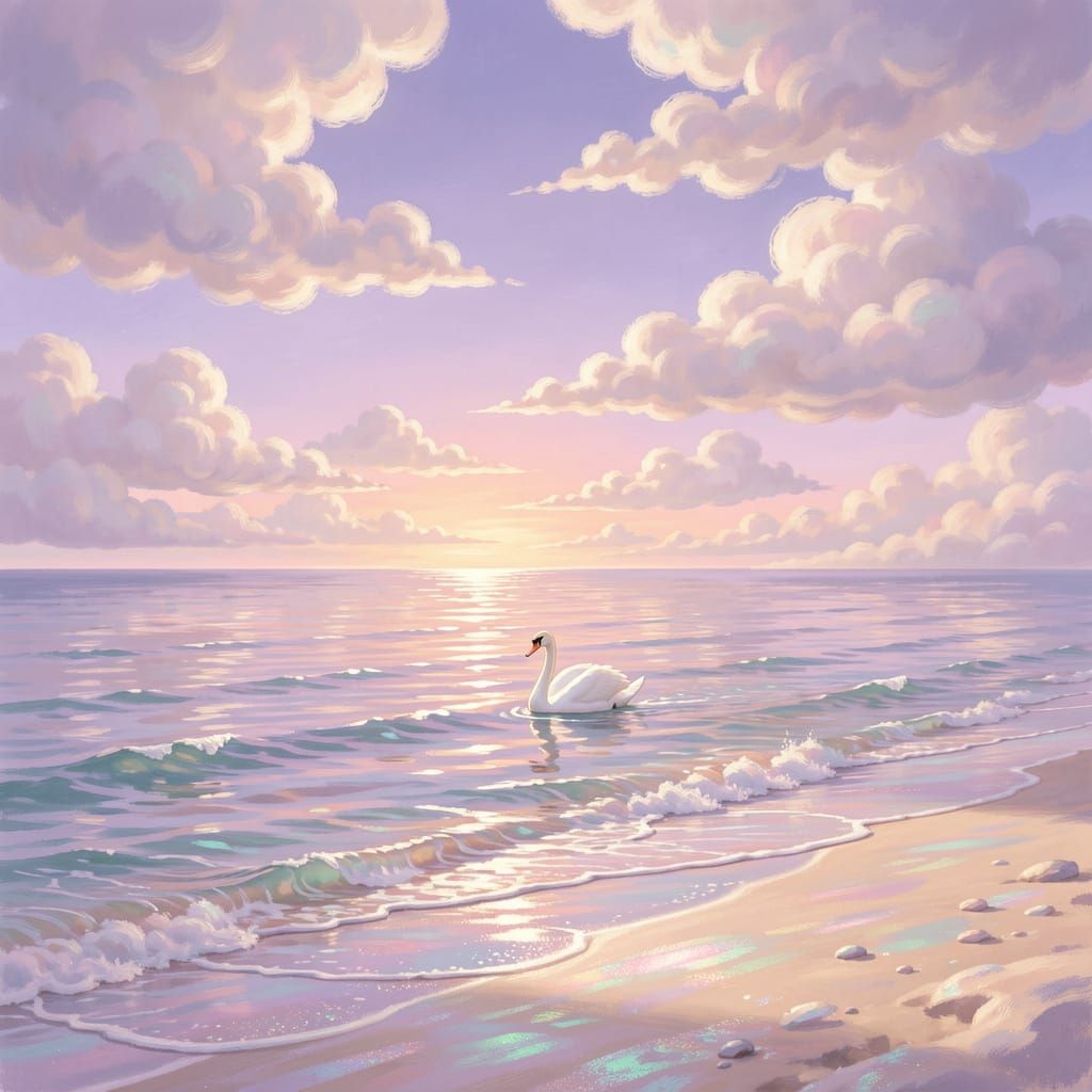 This image shows sentient clouds in a lavender sky above a tranquil ocean reflecting pastel colors. It's rendered in a soft, painterly style with dreamy, enchanting, and cinematic qualities.