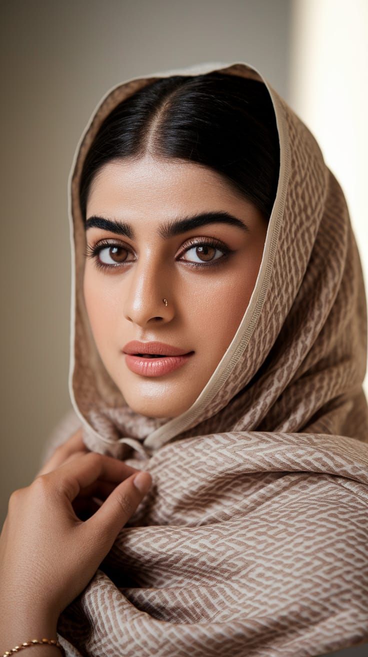 A serene portrait of a young Pakistani woman in a traditional sindhi ajrak patterned dupata, her captivating brown eyes gazing directly into the camera, set against a soft, neutral background