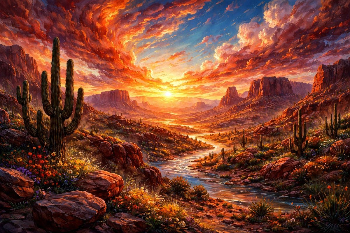 This image showcases a vibrant desert landscape under a fiery sky. Executed with expressive oil brushstrokes and a dreamlike color palette, it evokes quiet wonder.