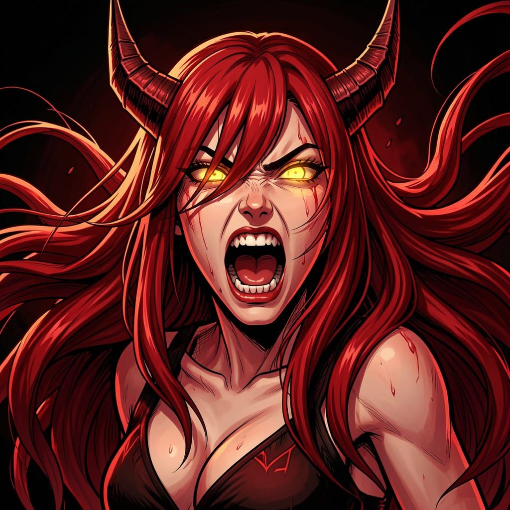 This illustration depicts a furious woman with demonic features, sharp horns, and glowing eyes. The artwork showcases dynamic posing and dramatic lighting in a vibrant red and dark color palette, rendered in a detailed anime style.