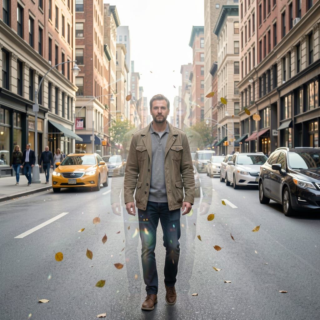 This ultra-photorealistic image depicts a bustling city street where a single individual experiences a localized time distortion, creating visual echoes and overlapping movements against a stable background.