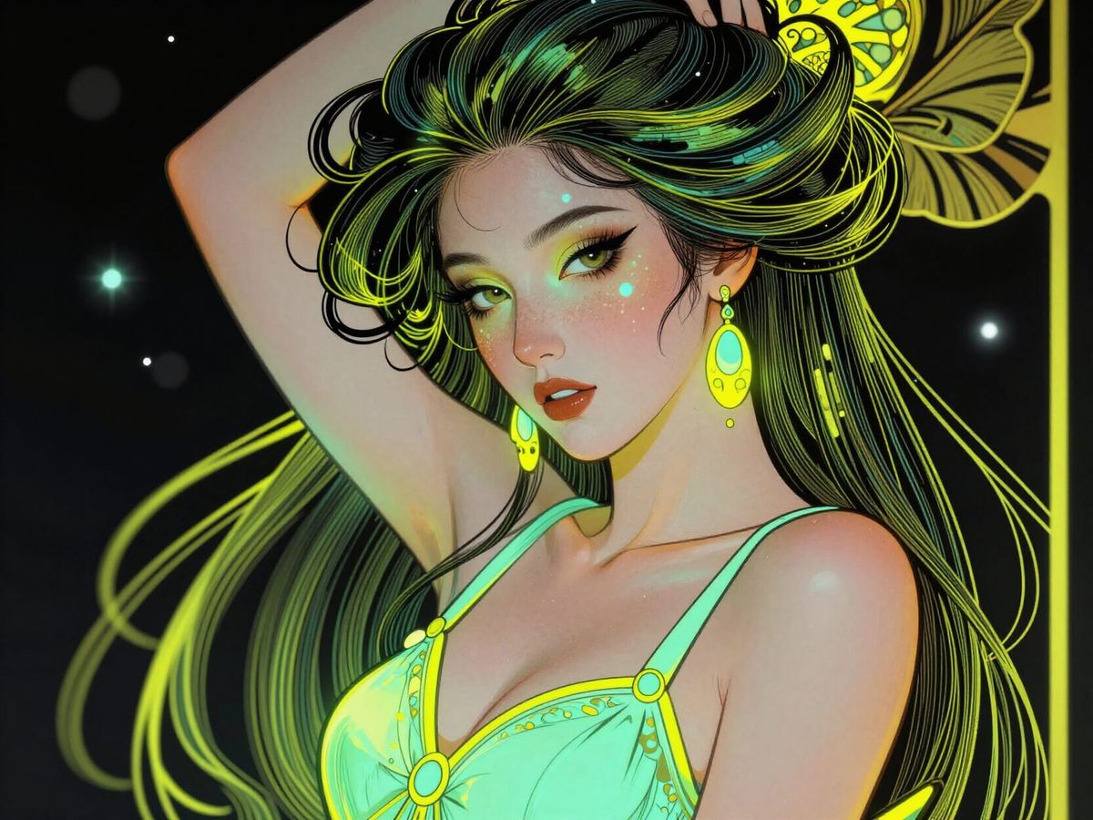This image shows a whimsical illustration of a dancer with perfect anatomy, featuring glowing neon accents and subtle bioluminescent freckles. Rendered with bold outlines and high-contrast lighting.