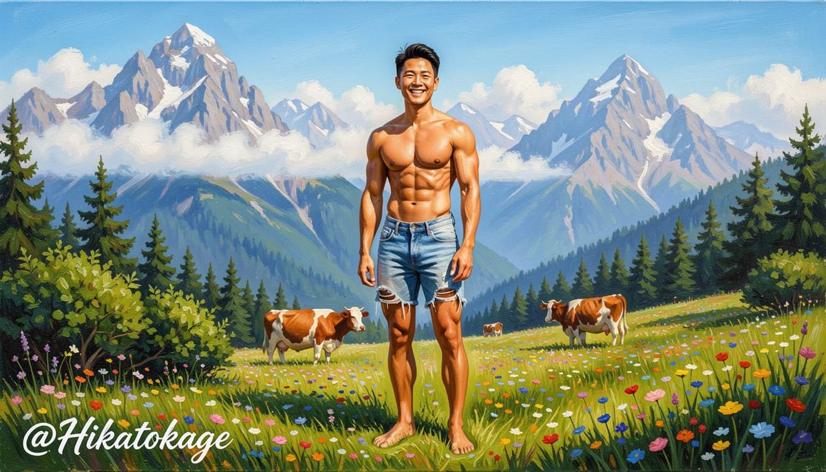 This oil painting captures a vibrant summer mountain meadow with a suntanned man enjoying the view. Features colorful flowers, trees, and distant peaks in a cheerful, uplifting mood.