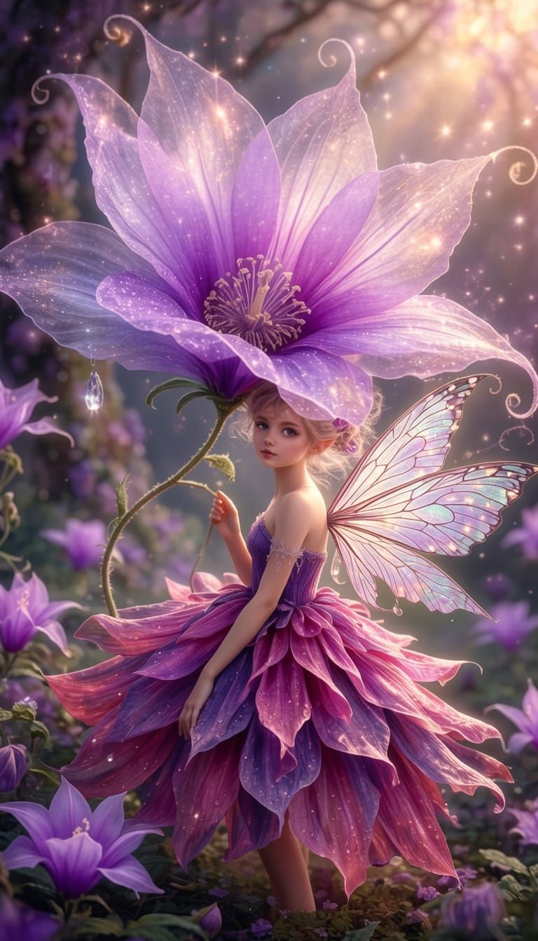 "A realistic looking, Very small morning glory flower fairy, fairy-sized to the flower, her dramatic flowing dress is formed entirely from long purple and pink morning glory petals layered into a gown with visible bearded details and natural texture, standing gracefully beside a large realistic morning ...
