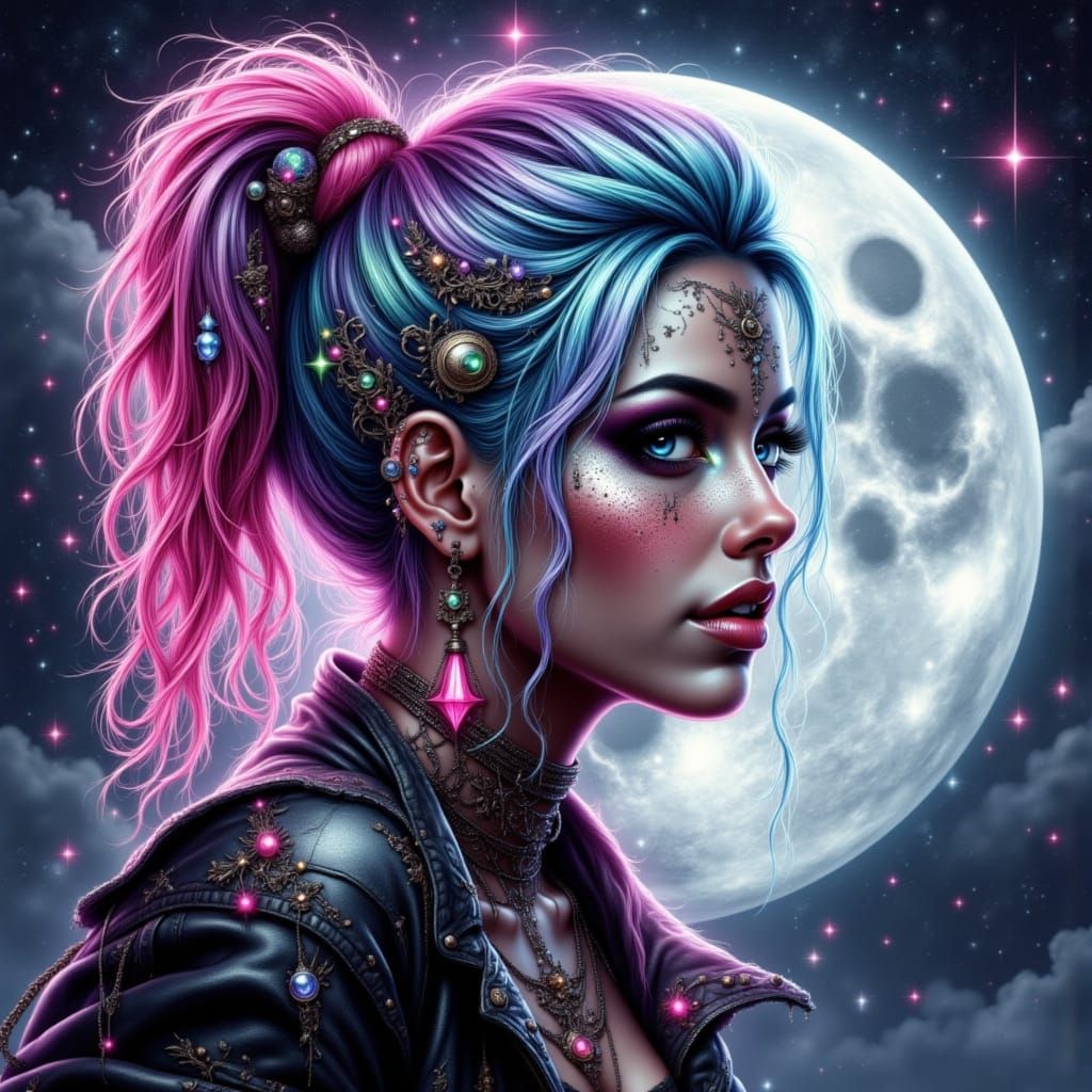 This image shows a stunning, ultra-realistic fantasy portrait of a woman with pink and grey dreadlocks, facial piercings, and mystical tattoos, set against a silver moon backdrop with a soft, ethereal glow.