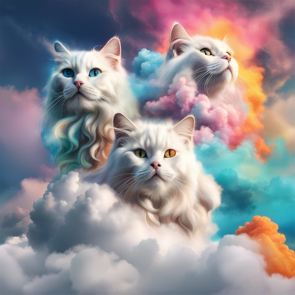 A hyperrealistic image of cats made of clouds floating in the sky. The mid-shot concept art features intricate details, dramatic lighting, and a colorful background.